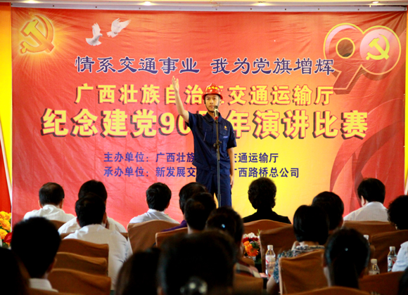 6月10日上午,由集團(tuán)公司承辦的全區(qū)交通運(yùn)輸系統(tǒng)慶祝建黨90周年“情系交通事業(yè),我為黨旗增輝”演講比賽在南寧舉行。自治區(qū)交通運(yùn)輸廳副廳長梁毅、副巡視員黃小幸、廳長助理劉昕等領(lǐng)導(dǎo),廳直屬單位的領(lǐng)導(dǎo)及觀眾共350人到現(xiàn)場觀看比賽。自治區(qū)直屬企事業(yè)工會(huì)副主任陳元滾、自治區(qū)直屬機(jī)關(guān)工委組織部部長李祖循等領(lǐng)導(dǎo)應(yīng)邀參加。來自廳直屬單位共23位選手參加了此次比賽。