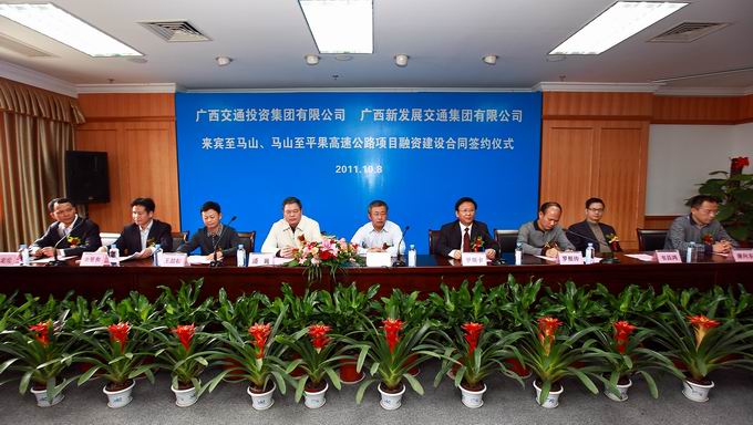 10月8日,集團(tuán)公司和廣西交通投資集團(tuán)公司來賓至馬山、馬山至平果高速公路項(xiàng)目融資建設(shè)合同簽約儀式在南寧舉行。自治區(qū)交通運(yùn)輸廳廳長潘巍、總工程師王劼耘;集團(tuán)公司董事長、黨委書記朱堅(jiān)和,總經(jīng)理李定倫,黨委副書記、紀(jì)委書記張友坐,副總經(jīng)理劉明洪,總會(huì)計(jì)師鄧遠(yuǎn)志,總工程師覃炳賢;交投集團(tuán)副董事長、總經(jīng)理、黨委副書記劉可,黨委副書記、紀(jì)委書記羅斯卡,副總經(jīng)理韋昌鴻、廉向東,及雙方有關(guān)部門、直屬各單位負(fù)責(zé)人參加了簽約儀式。