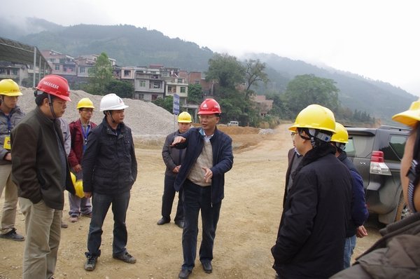 圖為集團(tuán)公司總經(jīng)理李定倫(圖中)、總工程師覃炳賢(右二)在那平路項(xiàng)目施工現(xiàn)場指導(dǎo)工作