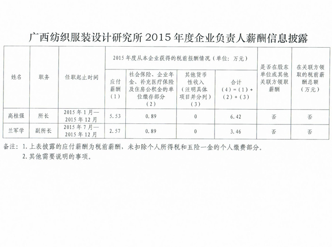 廣西紡織服裝設(shè)計研究所2015年度企業(yè)負(fù)責(zé)人薪酬信息披露