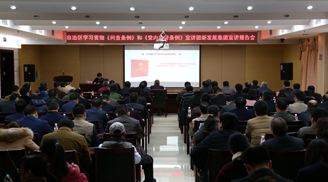 2017年2月24日上午,自治區(qū)學(xué)習(xí)貫徹《中國共產(chǎn)黨問責(zé)條例》《中國共產(chǎn)黨黨內(nèi)監(jiān)督條例》宣講團(tuán)到集團(tuán)公司舉行宣講報告會,自治區(qū)紀(jì)委宣傳部部長陳柳青作宣講報告,集團(tuán)公司黨委副書記、副董事長、總經(jīng)理唐咸秋主持會議。