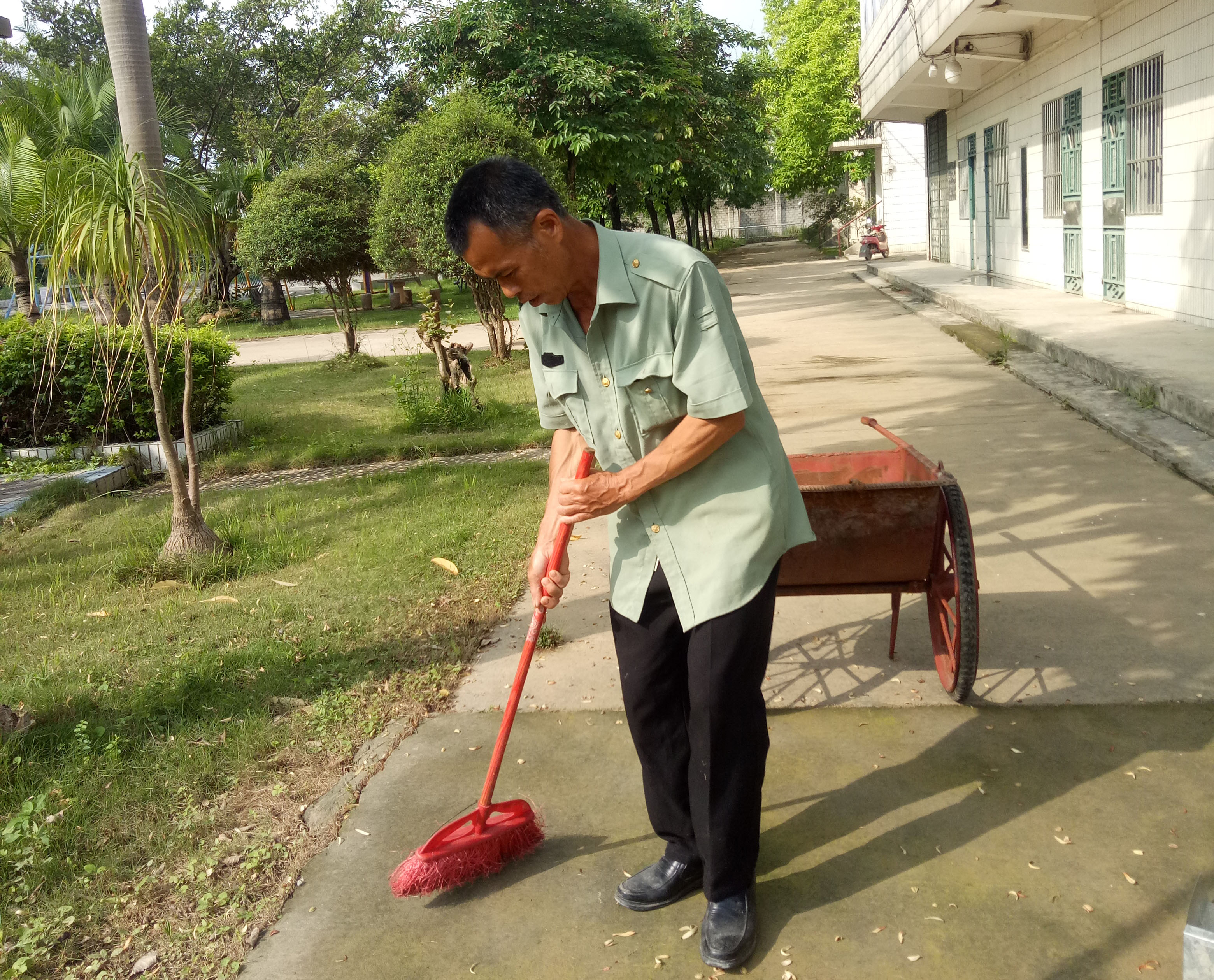 54歲的莫金刀是第一次外出務(wù)工,之前他在家務(wù)農(nóng),兼職做村里的保潔,微薄的收入根本承擔(dān)不起兩個(gè)女兒上大學(xué)的費(fèi)用,但又沒有技能和途徑找得到其他工作。翔路公司安排莫金刀負(fù)責(zé)建設(shè)辦的保安兼保潔工作,讓他有了一份穩(wěn)定的收入,能夠支撐起整個(gè)家庭。