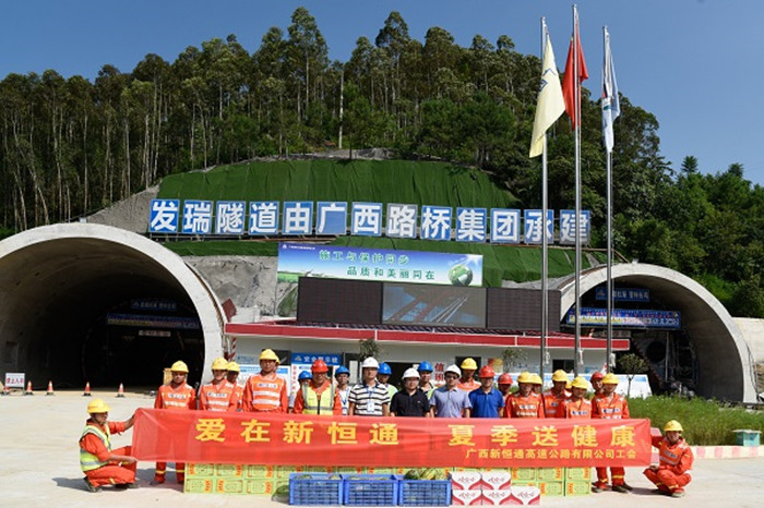 8月14-15日,新恒通公司黨委副書記、副董事長、總經(jīng)理、總工程師藍日彥,公司黨委委員、常務副總經(jīng)理蘇偉勝,公司黨委委員、副總經(jīng)理、都巴高速指揮部黨支部書記、指揮長陸原恩一行到都巴高速五分部發(fā)瑞隧道出口、三分部紅水河特大橋施工現(xiàn)場,深入施工一線慰問都巴高速六個分部的一線工人,為他們送去了防暑降溫慰問品,表達了對一線工人的關(guān)懷,感謝他們炎炎夏日下的堅守。