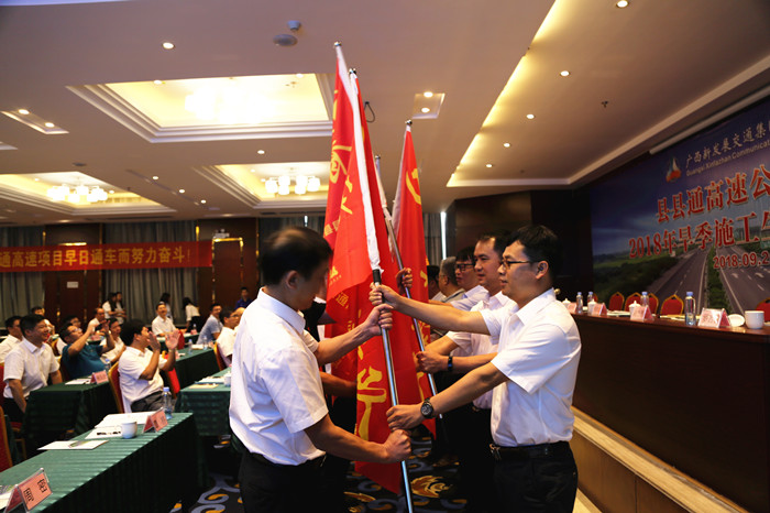 會(huì)上,與會(huì)領(lǐng)導(dǎo)為各參建單位代表授“黨員先鋒隊(duì)”及“青年突擊隊(duì)”旗子。會(huì)上還開(kāi)展了旱季施工質(zhì)量安全承諾簽字活動(dòng)。