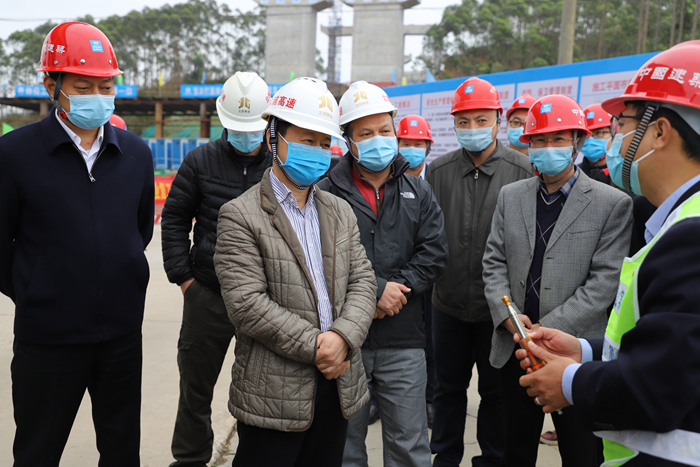 3月5日,自治區(qū)交通運(yùn)輸廳副廳長王劼耘到大塘至浦北高速公路項(xiàng)目開展防疫及復(fù)工復(fù)產(chǎn)工作情況調(diào)研。自治區(qū)交通工程質(zhì)量安全監(jiān)督站站長陳津維、自治區(qū)高速公路發(fā)展中心主任周北、欽州市政府副秘書長黃立和一同調(diào)研。