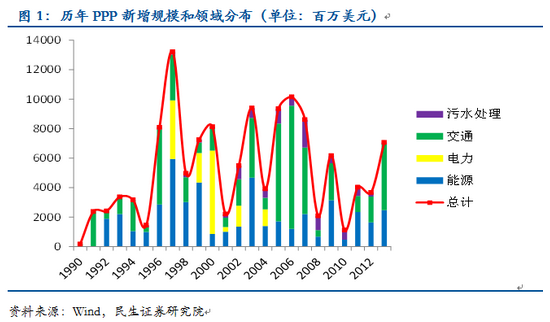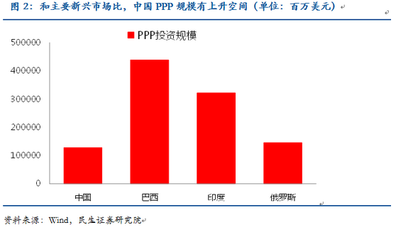 根據(jù)國務(wù)院研究發(fā)展中心的測(cè)算,到2020年,與城鎮(zhèn)化相關(guān)的融資需求約為42萬億元。根據(jù)43號(hào)文和《地方政府存量債務(wù)納入預(yù)算管理清理甄別辦法》的規(guī)定推演,未來地方政府性債務(wù)主要由一般政府債、專項(xiàng)政府債和PPP債構(gòu)成??梢姡瑧?yīng)對(duì)未來幾十年城鎮(zhèn)化的資金缺口,PPP模式被委以了重任。 從43號(hào)文規(guī)定來看,對(duì)于新增政府債務(wù),推廣使用政府與社會(huì)資本合作模式。鼓勵(lì)社會(huì)資本通過特許經(jīng)營等方式,參與城市基礎(chǔ)設(shè)施等有一定收益的公益性事業(yè)投資和運(yùn)營。對(duì)于存量政府債務(wù),在建工程確實(shí)沒有其他建設(shè)資金來源的,應(yīng)主要通過政府與社會(huì)資本合作模式和地方政府債券解決后續(xù)融資。 PPP模式具有較大的發(fā)展?jié)摿?。一方面?013年中國PPP項(xiàng)目的累計(jì)總投資為1278億美元,和同類型新興市場(chǎng)比有較大的差距。另一方面,2013年新增的PPP投資額僅為7億美元,而2013年城投債的發(fā)行量則高達(dá)9512億元,若PPP模式成功替代城投主導(dǎo)的融資模式,其發(fā)展空間巨大。
