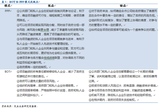 但從合作關(guān)系而言,BOT中政府與企業(yè)更多是垂直關(guān)系,即政府授權(quán)私企獨(dú)立建造和經(jīng)營設(shè)施,而不是與政府合作,PPP通過共同出資特殊目的公司更強(qiáng)調(diào)政府與私企利益共享和風(fēng)險(xiǎn)分擔(dān)。 PPP的優(yōu)點(diǎn)在于政府能夠分擔(dān)投資風(fēng)險(xiǎn),能夠降低融資難度,雙方合作也能夠協(xié)調(diào)不同利益主體的不同目標(biāo),形成社會(huì)利益最大化,但缺點(diǎn)在于增加了政府潛在的債務(wù)負(fù)擔(dān)。BOT優(yōu)點(diǎn)在于政府最大可能的避免了項(xiàng)目的投資損失,缺點(diǎn)是投資風(fēng)險(xiǎn)大,私營資本可能望而卻步,且不同利益主體的利益不同,單方面利益最大化的納什均衡并非全社會(huì)最優(yōu)。 ![]()